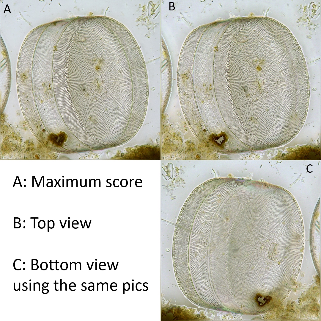Diatom cell Coscinodiscus spec., PICOLAY results with normal stacking, top view and bottom view using the same image stack. Click to enlarge.